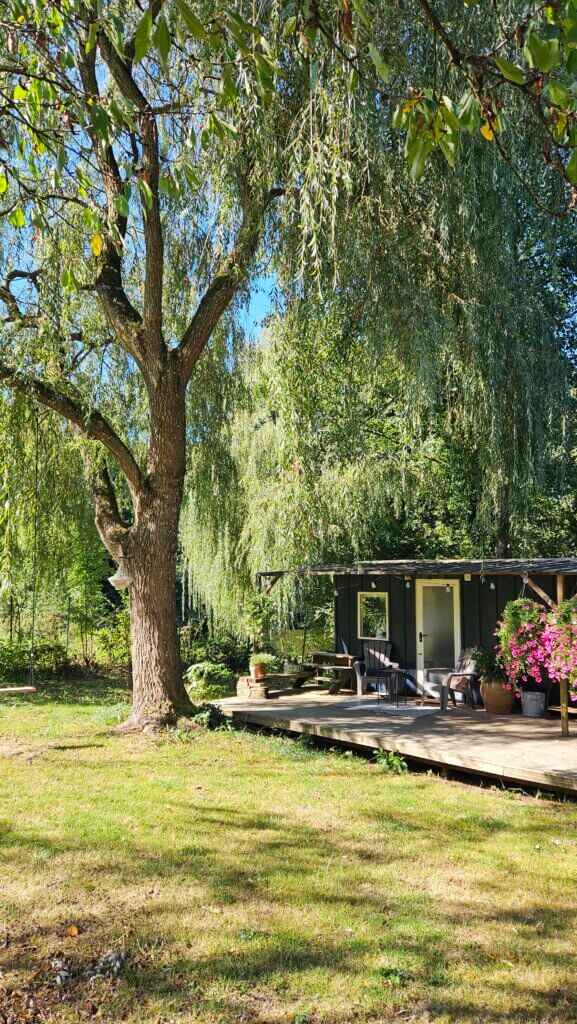De cabin staat aan het begin van ons erf, gelegen aan een doodlopende weg.